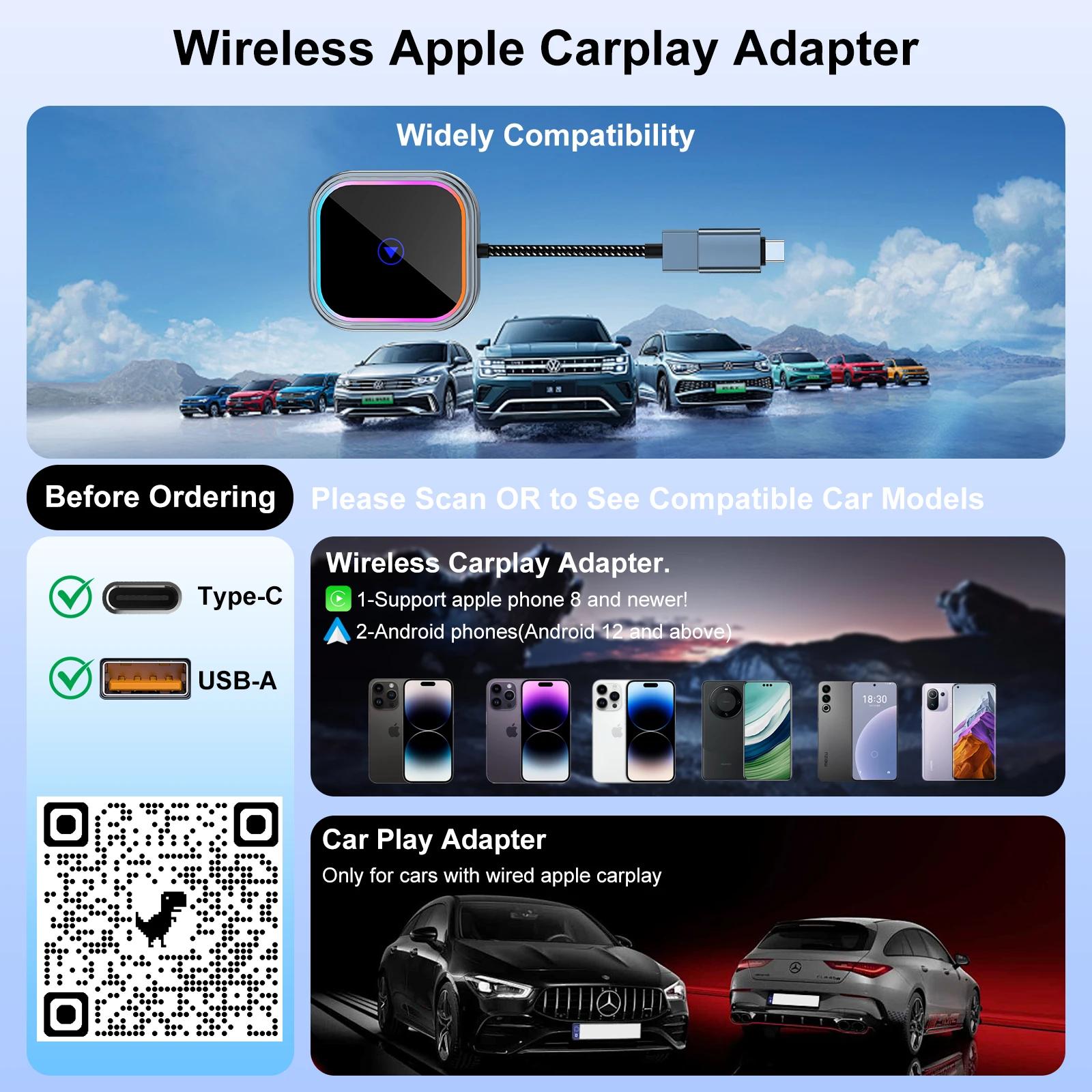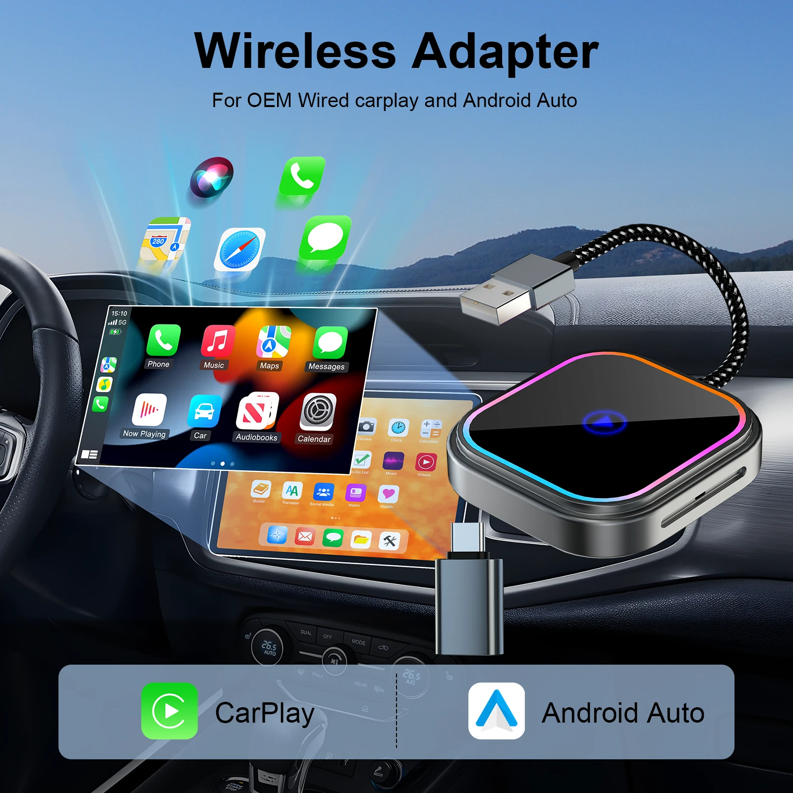 Functionality: This CarPlay dongle works like magic! Equipped with 2.4Ghz and 5Ghz module for the best connection and experience possible. The CarPlay adapter also comes with USB-A to USB-A cable extension for tight fit areas and a USB-A to USB-C cable for cars with car stereos who have USB-C ports