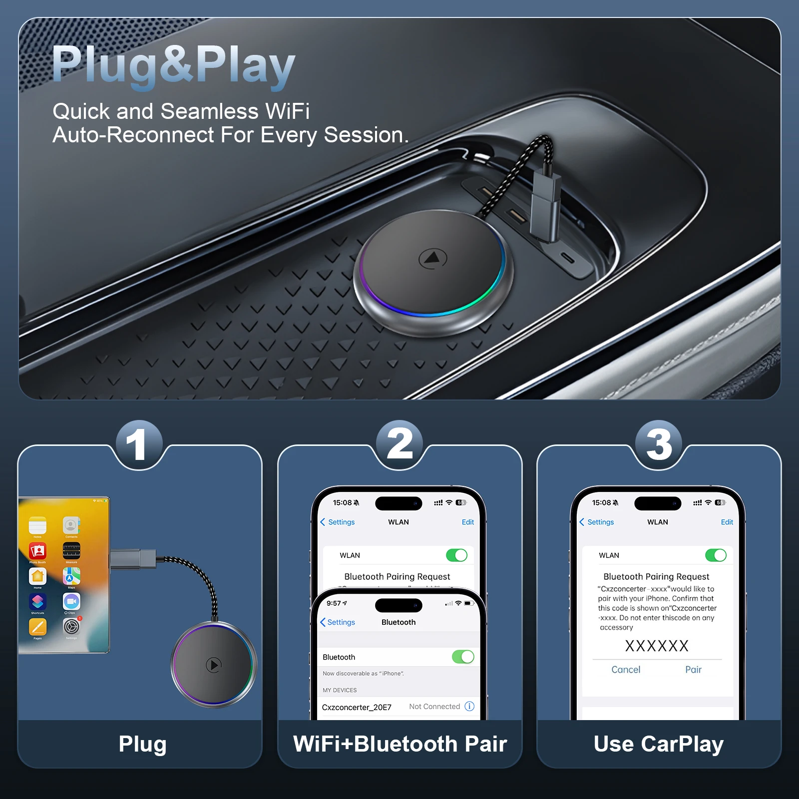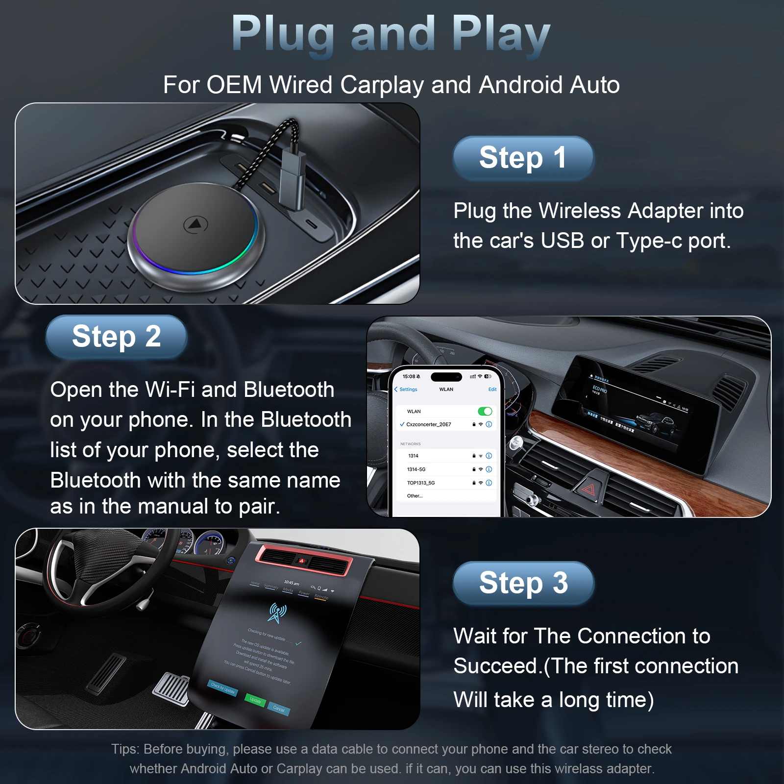 Overview:Convert the original car's wired CarPlay/Android auto to wireless CarPlay/Android auto Automatically connect after getting in the car